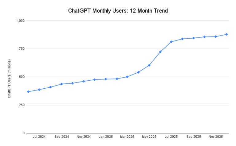 ChatGPT a enregistré une croissance de 82% entre janvier et décembre 2025, passant de481 millions à878 millions d’utilisateurs mensuels.
