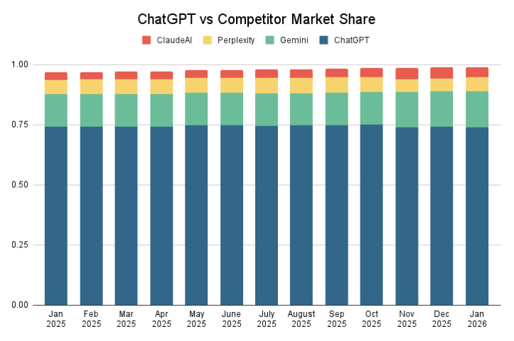 Oui, ChatGPT domine largement le marché avec74,2% de part de marché en décembre 2025. Ses principaux concurrents sont Google Gemini (14,8%), Perplexity (5,1%) et Claude AI (4,7%).