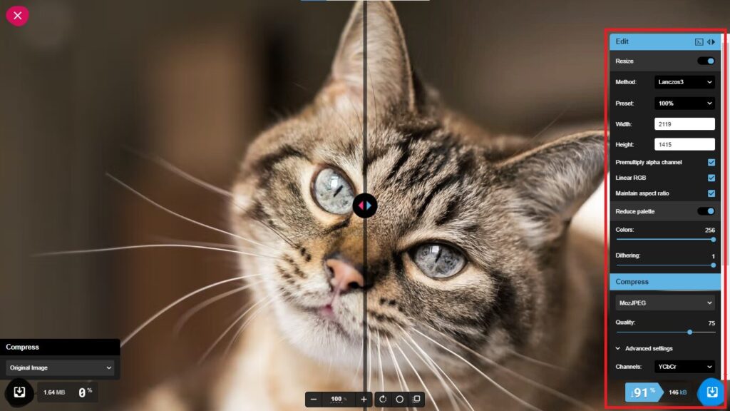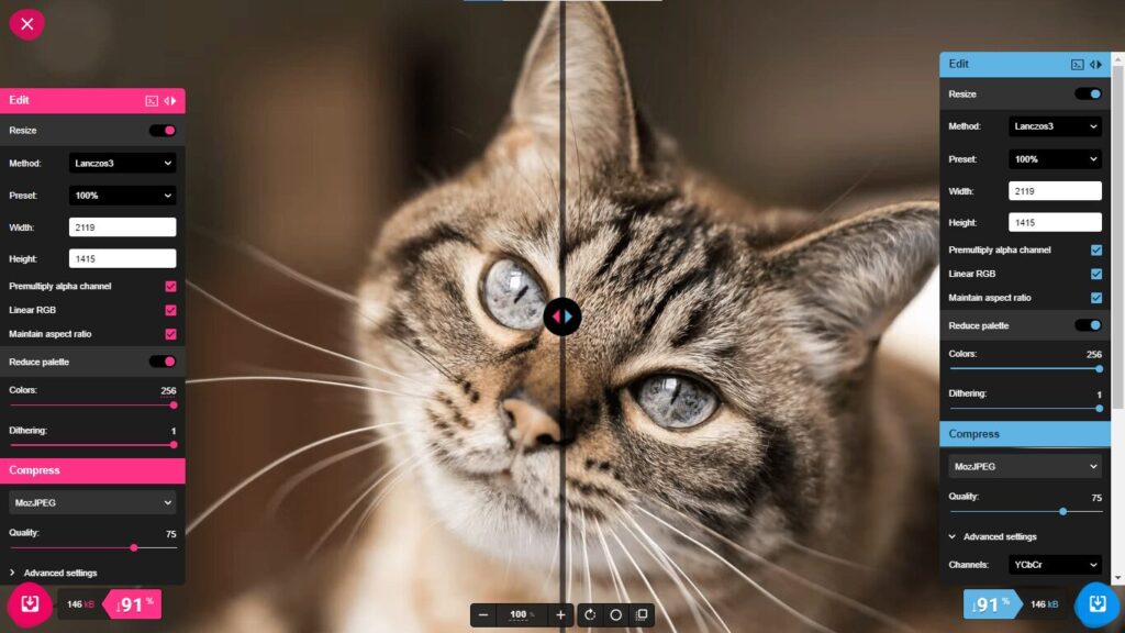 • Le point fort : Un contrôle total. Vous pouvez ajuster manuellement le niveau de compression, redimensionner l’image et surtout comparer en temps réel l’original et le résultat via un curseur avant/après.