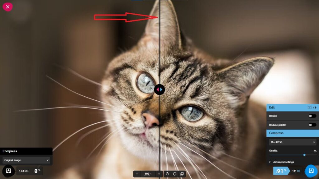 La partie à gauche montre un aperçu de l’image d’origine et celle de droite montre un aperçu de la version compressée. Ce curseur peut être glissé vers la gauche et la droite  pour modifier les deux parties.