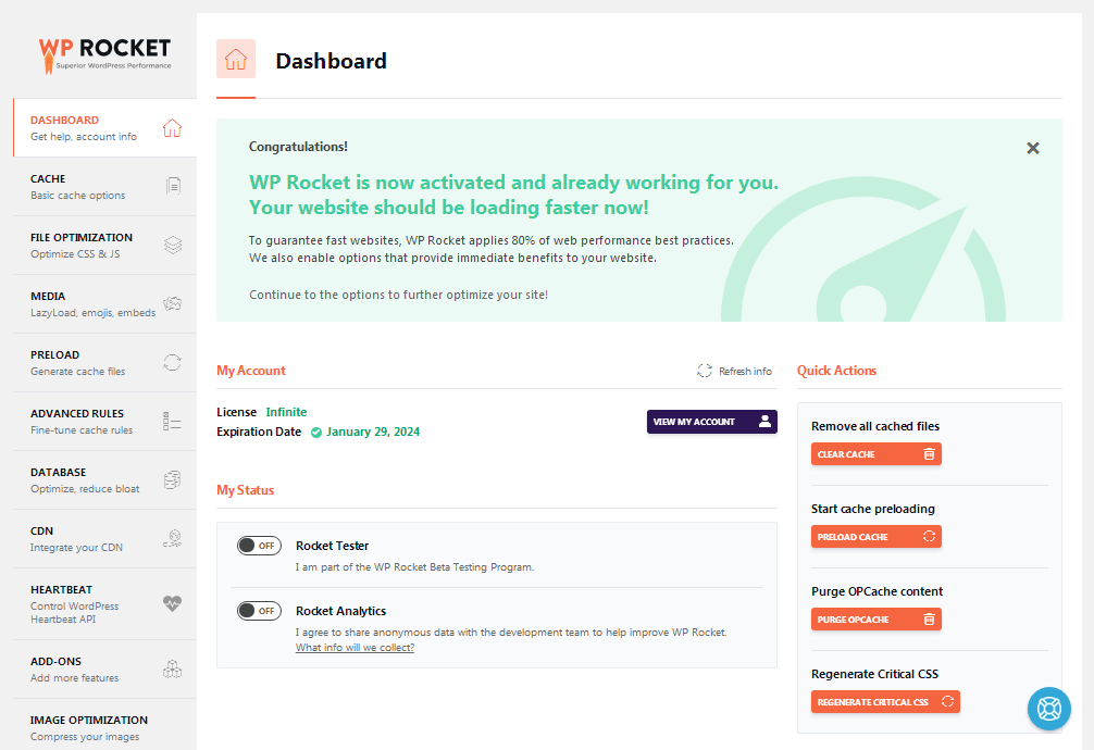 These are 3 factors that can dramatically improve your site’s performance. The rest of the settings are optional features that you can do without. However, if you still want to boost your SEO performance, here are the rest of the WP Rocket features to discover through the different tabs present on the dashboard: