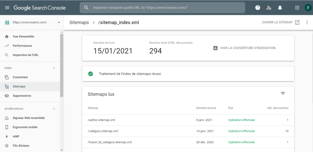 Ensuite dans la barre latérale gauche, cliquer sur les options « Sitemap » et « Couverture » situées juste en dessous de l’onglet « Index » :