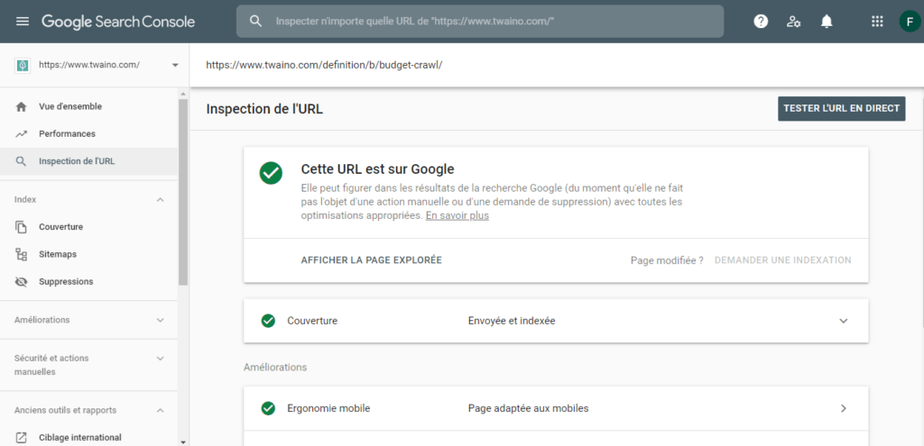 - Surveillez l’URL concernée avec l’outil d’inspection d’URL de Google ;