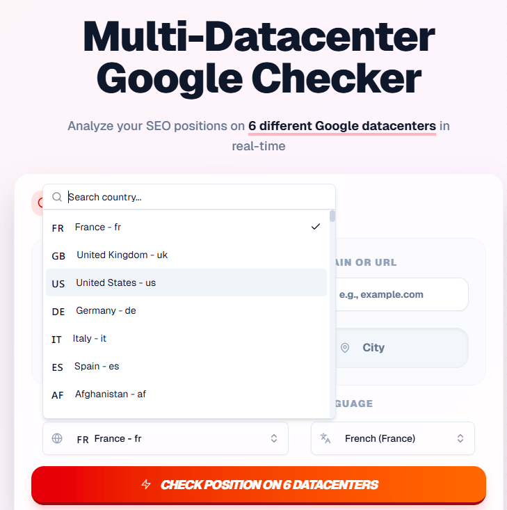L’interface de SEO Hero Ninja – Multi-Datacenter Google Checker a été pensée pour être la plus intuitive possible. Pas de menus superflus : tout se passe sur un seul et même écran. En quelques clics, l’outil va analyser votre position SEO en temps réel sur 6 centres de données Google différents.